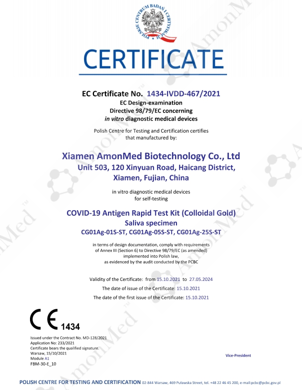 2021年10月15號,波蘭PCBC機構國際公告(公告號1434),正式頒布奧德生物新型冠狀病毒抗原快速檢測試劑盒 (膠體金法)唾液拭子歐盟自測CE認證證書。奧德CE證書是按照歐盟8月份頒布的新法規準備的技術文件。