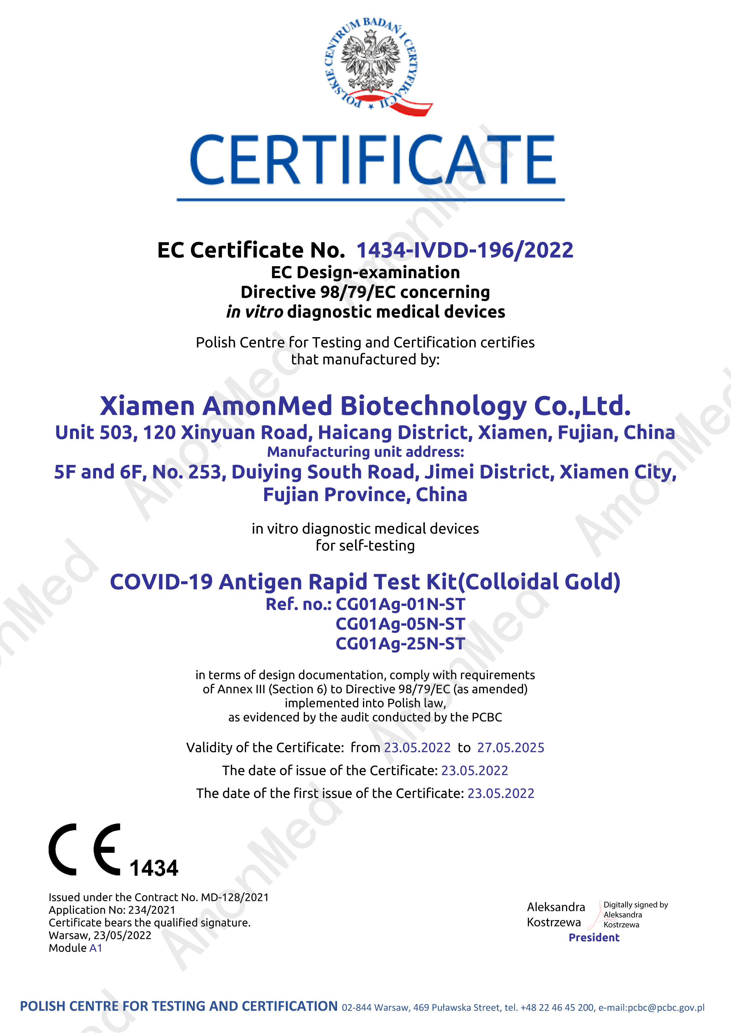 2022年5月23日,廈門奧德生物自主研發的,用于個人和家庭自測的,前鼻拭子新型冠狀病毒抗原快速檢測試劑盒 (膠體金法),正式獲得歐盟公告機構PCBC認證的CE證書。此次CE認證,意味著廈門奧德生物家用自測版前鼻拭子新冠抗原測試試劑盒可在歐盟27個成員國及其他認可歐盟CE認證的國家上市銷售。